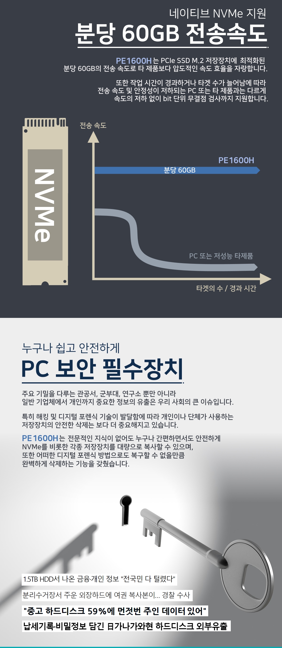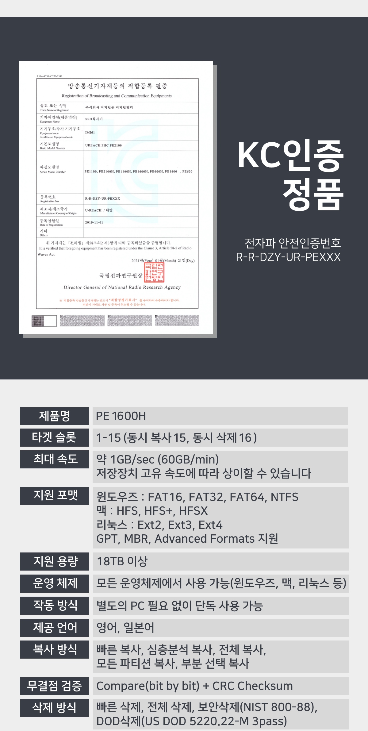 PE1600H  (1:15 최대 60G/분당/ M.2 NVME/NGFF 지원,  PCI-e HDD/SSD 삭제복사기,  HDD WIPE, DOD ERASE)